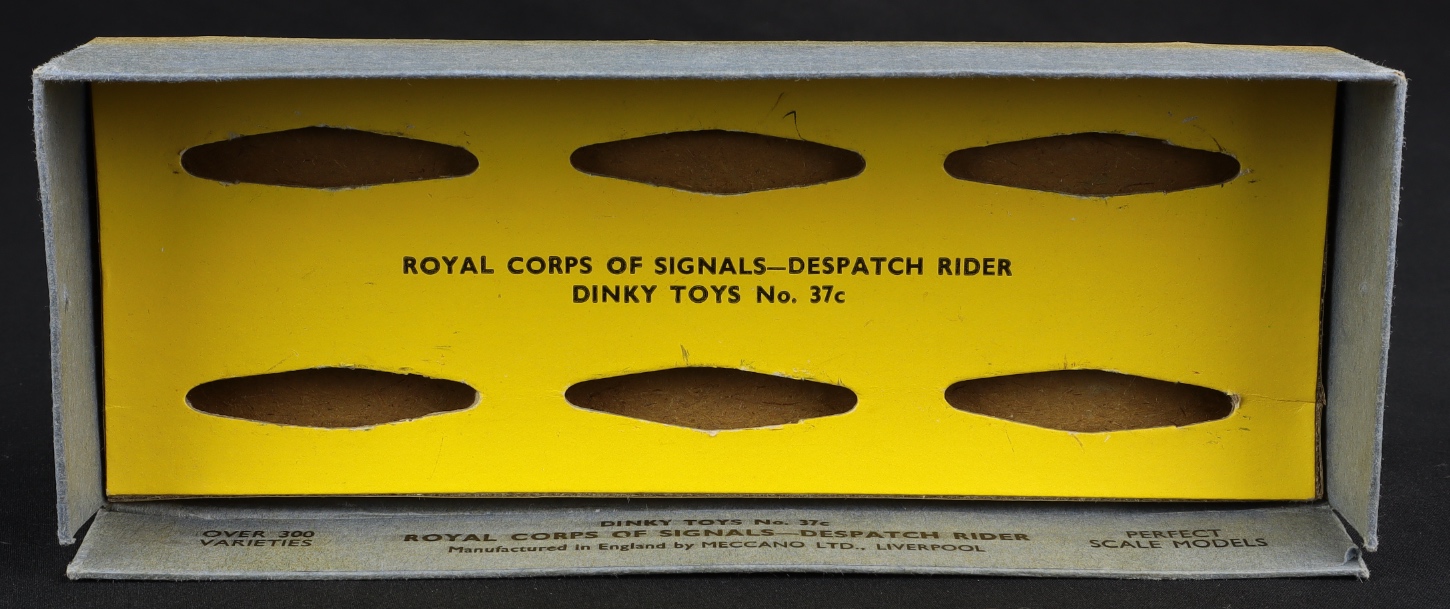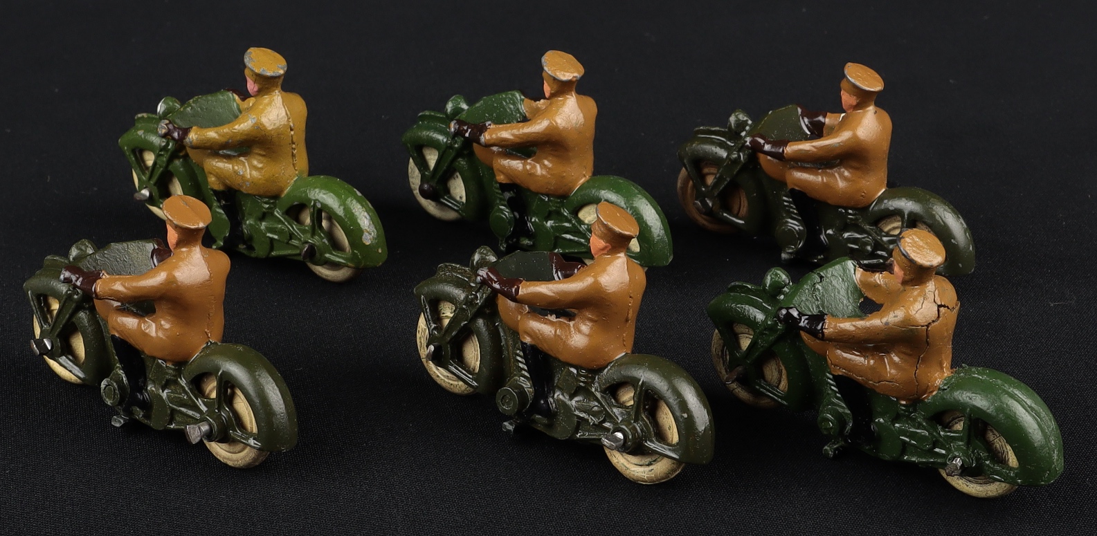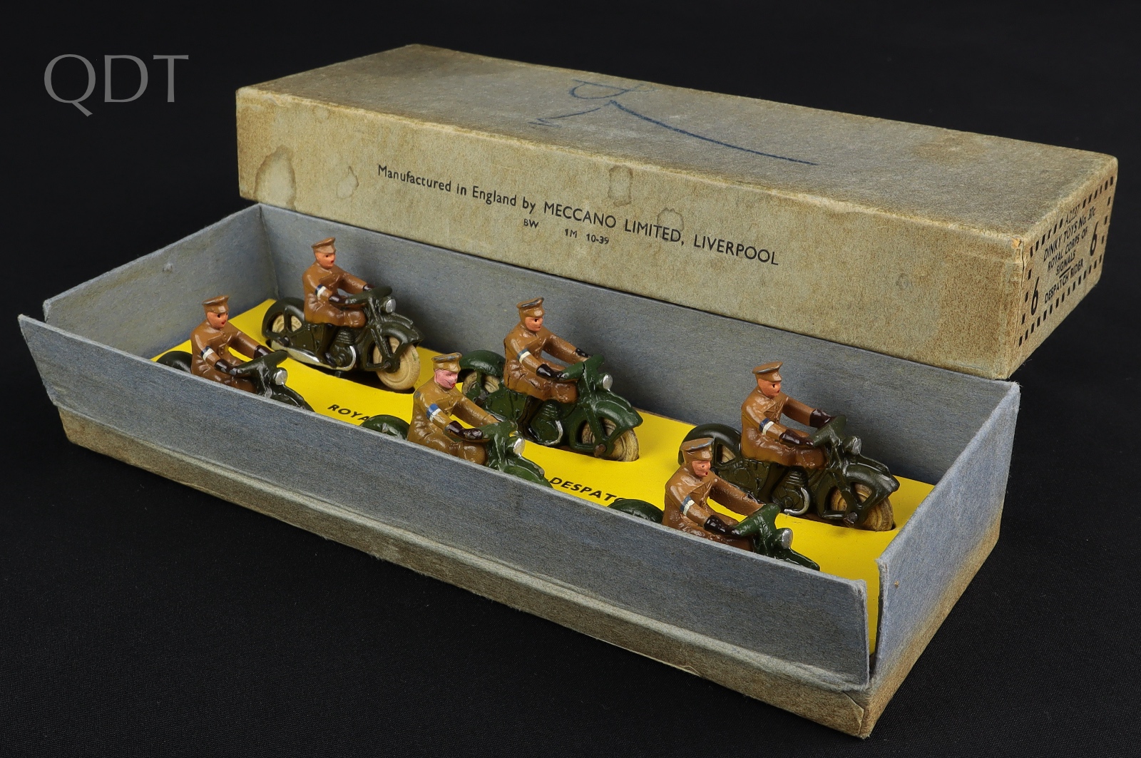 Royal Signals Despatch Rider x 6 in original Trade Box. Near mint plus -very near mint/never individually boxed. Scarce early old shop stock item from The Heart of England Collection. From October 1939. QDT starting bid £500. Please note that QDT apply 12.5% buyer's commission.