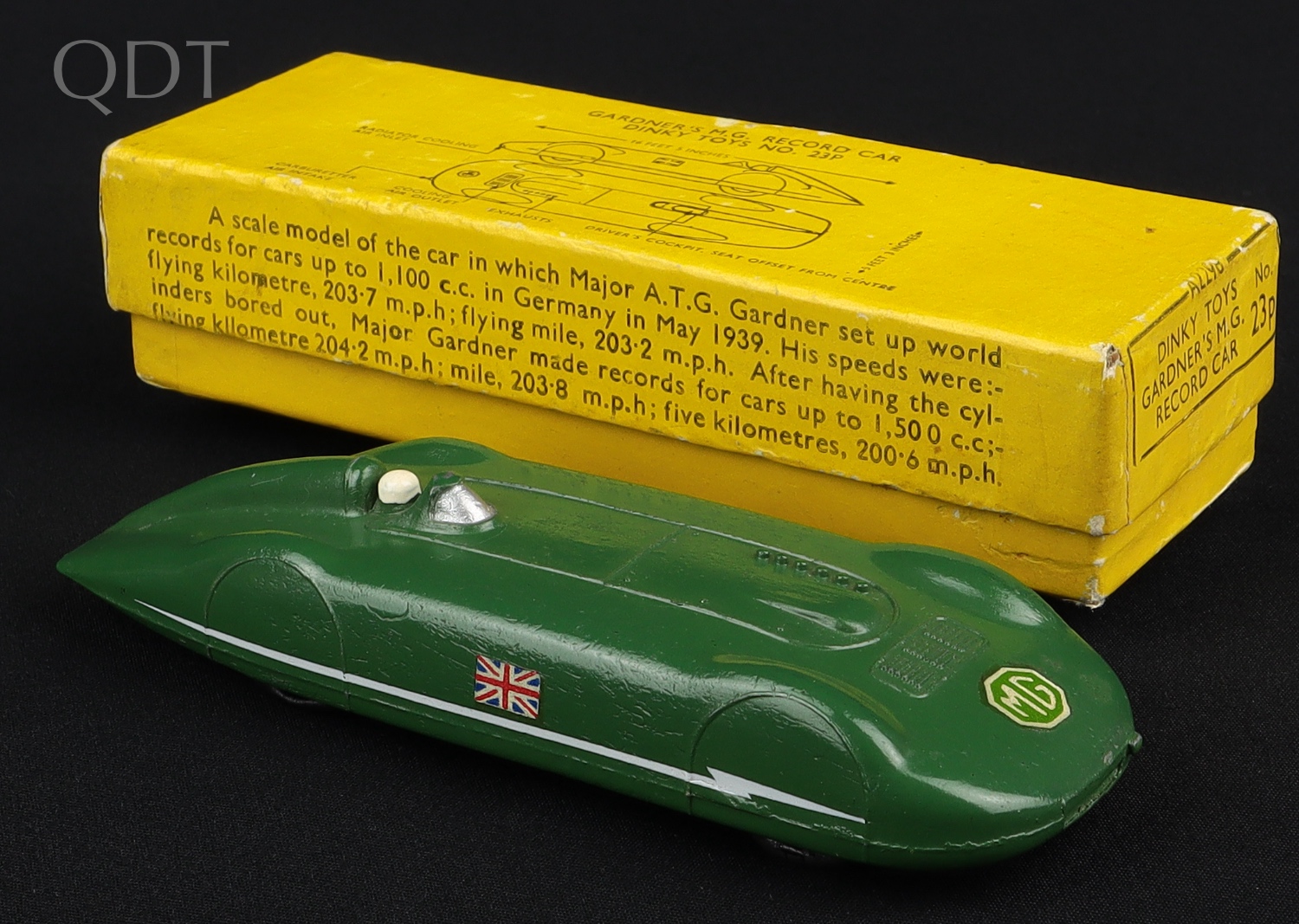 Gardner's MG Record Car by Dinky Toys 23P. Very near mint/boxed. Scarce Pre-war model from The Heart of England Collection. From 1939. QDT starting bid £300. Please note that QDT apply 12.5% buyer's commission.
