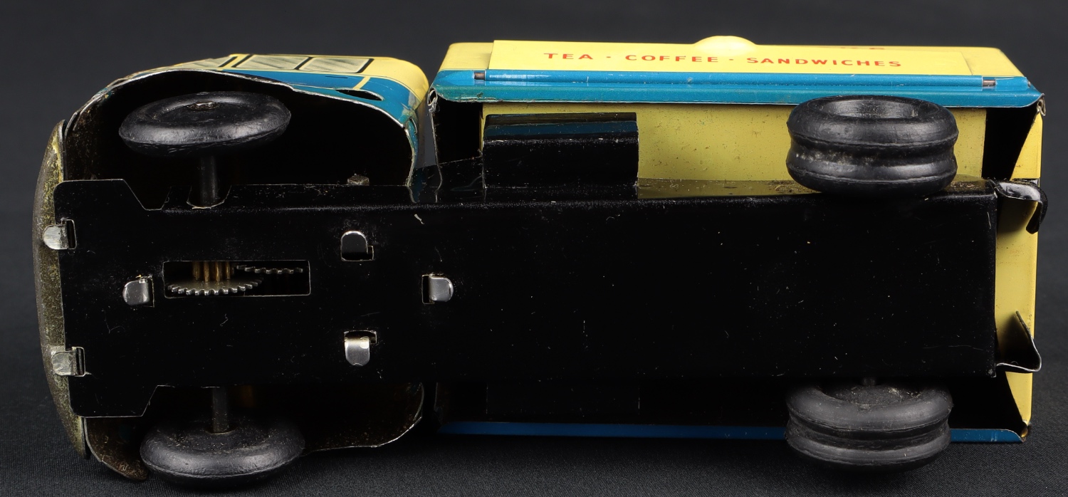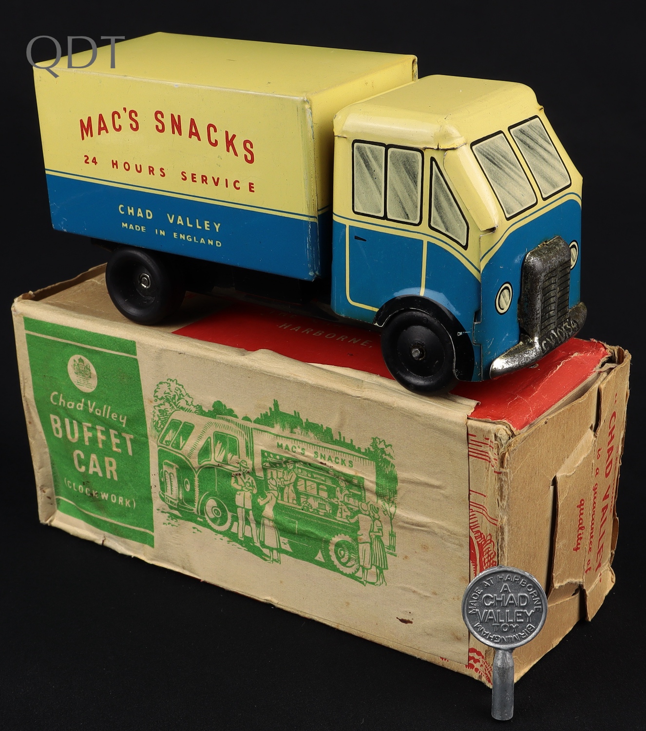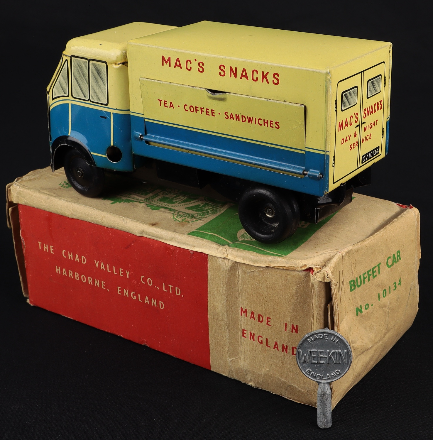 Buffet Car "MAC'S SNACKS" by Chad Valley, No. 10134. Very near mint/boxed. With working motor & Chad Valley Weekin Key. Scarce model from The Denis Tyler Collection. QDT starting bid £100. Please note that QDT apply 12.5% buyer's commission.