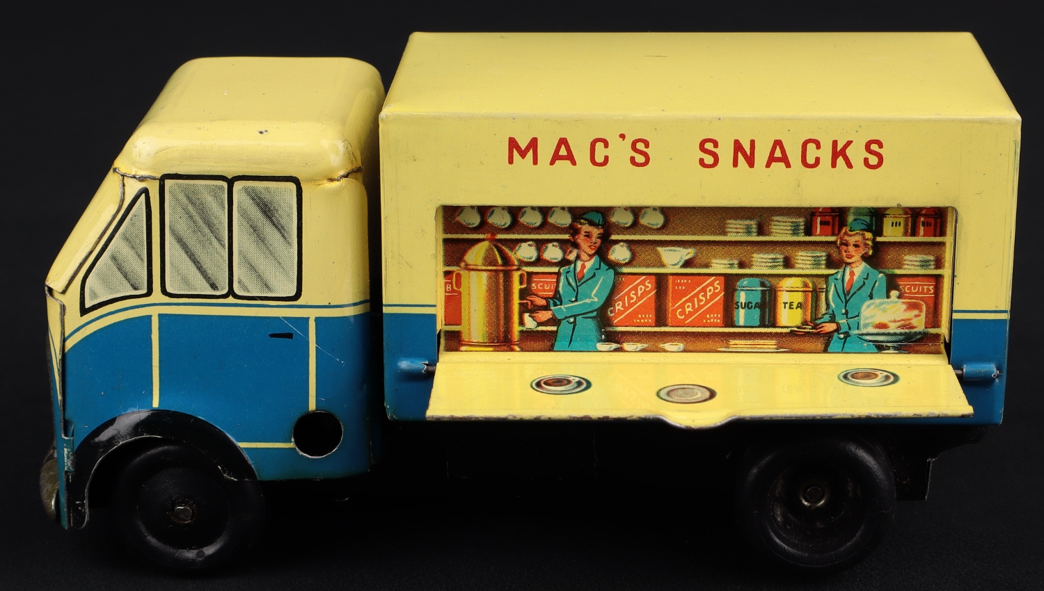 MAC’S SNACKS lettering is complete. on both sides Lithography generally is unrubbed. Radiator and bumper has dulled somewhat. Number-plate still visible.