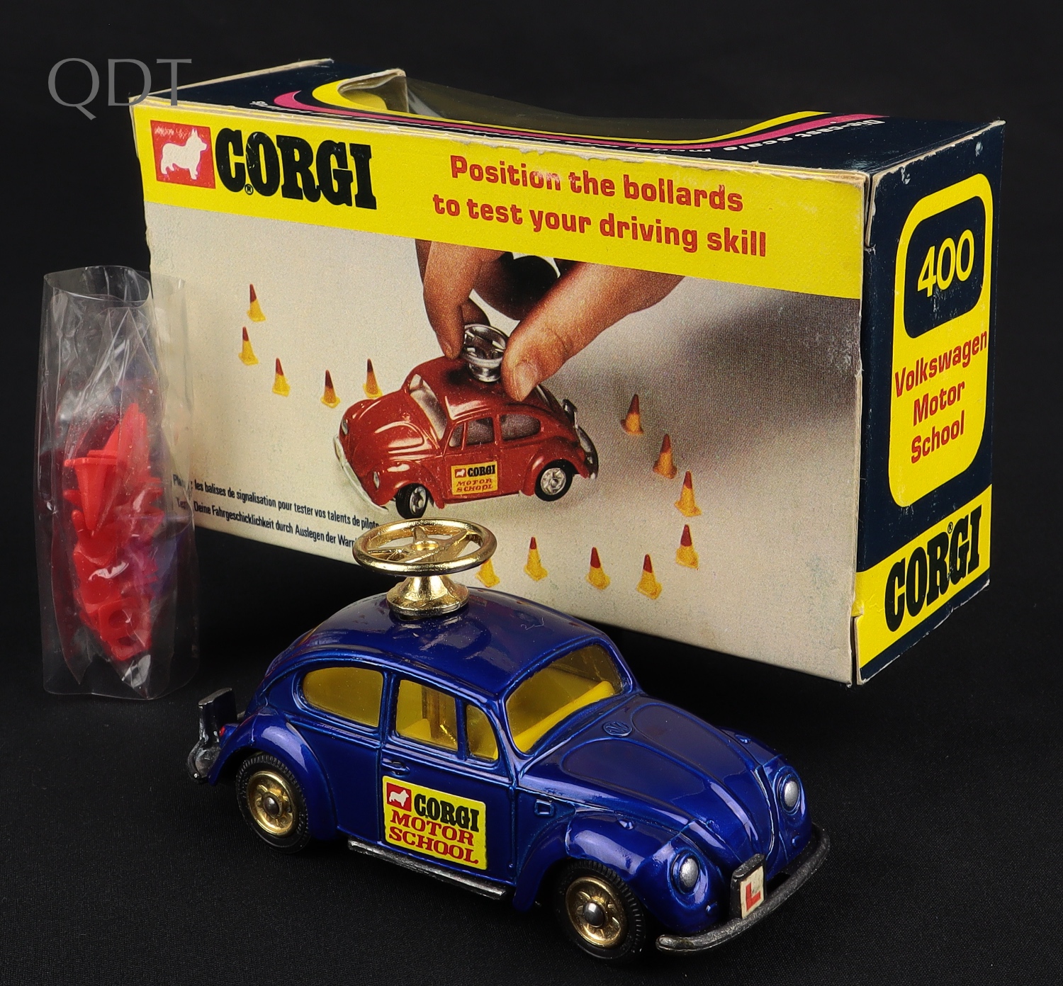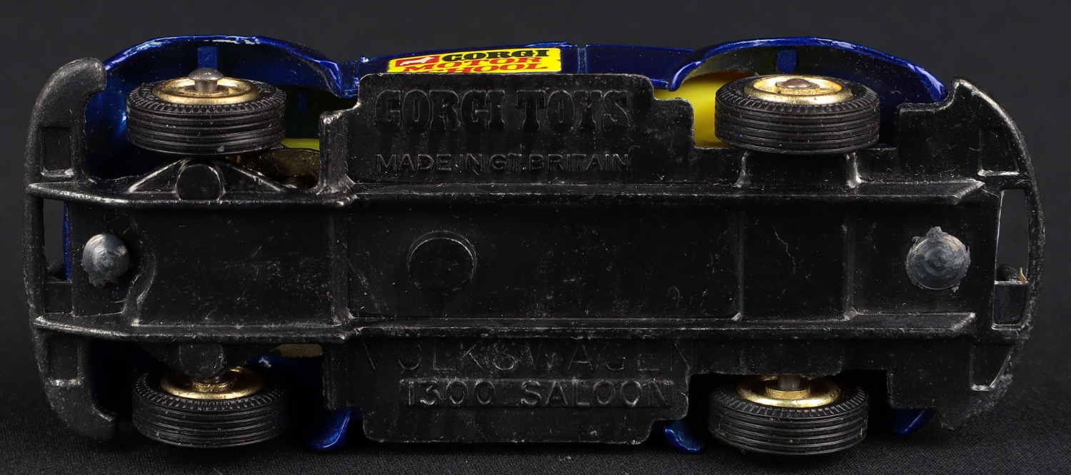 VW 1300 Motor School Car by Corgi Toys, No. 400. With bagged cones. Very near mint/boxed. Scarce with BLACK (Probably factory unfinished) BASE & BUMPERS. From The Elmer Collection.
