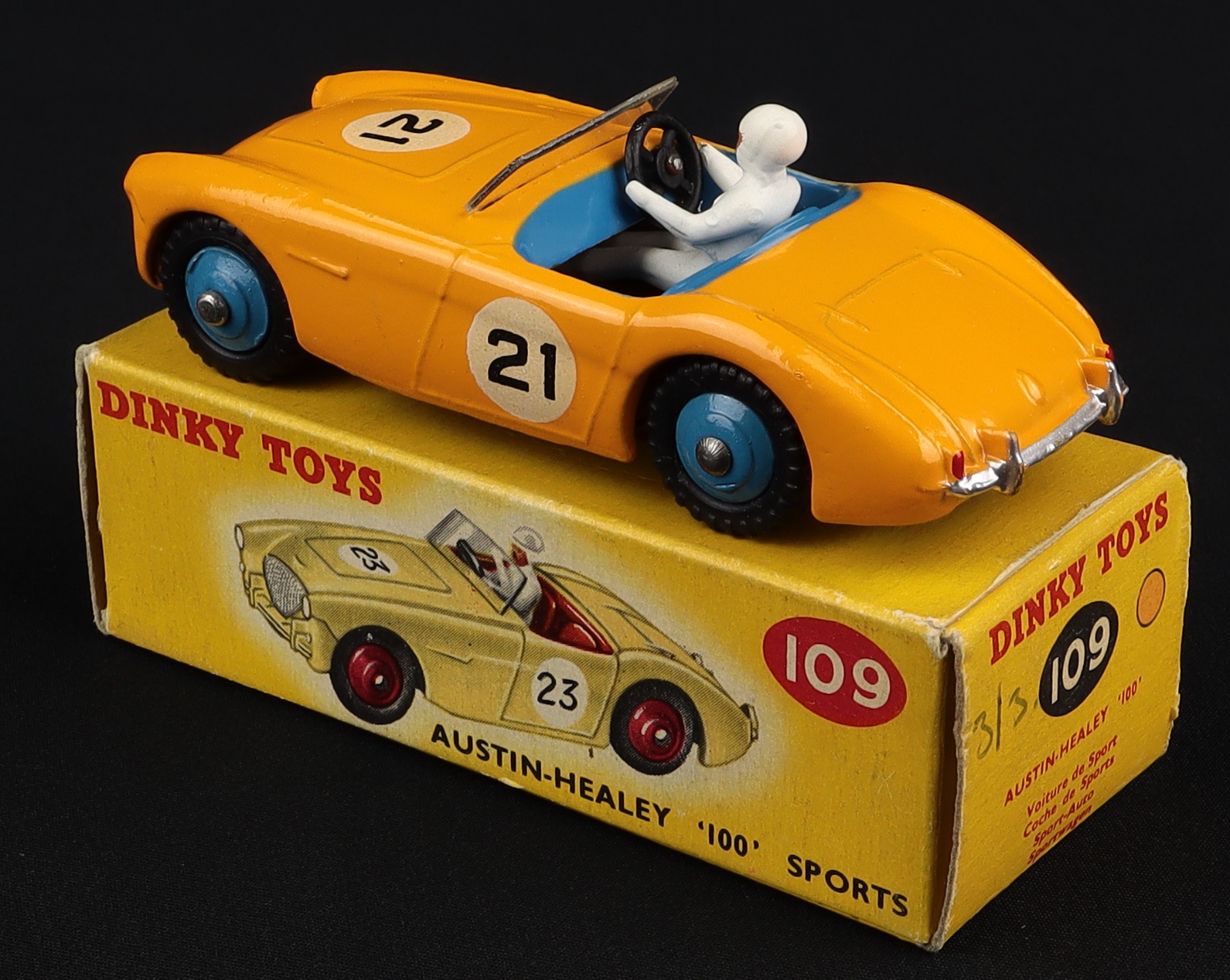Austin-Healey '100' Sports by Dinky Toys, No. 109. DEEPER orange-yellow version. Very, very near mint/boxed. From The QDT Vault.