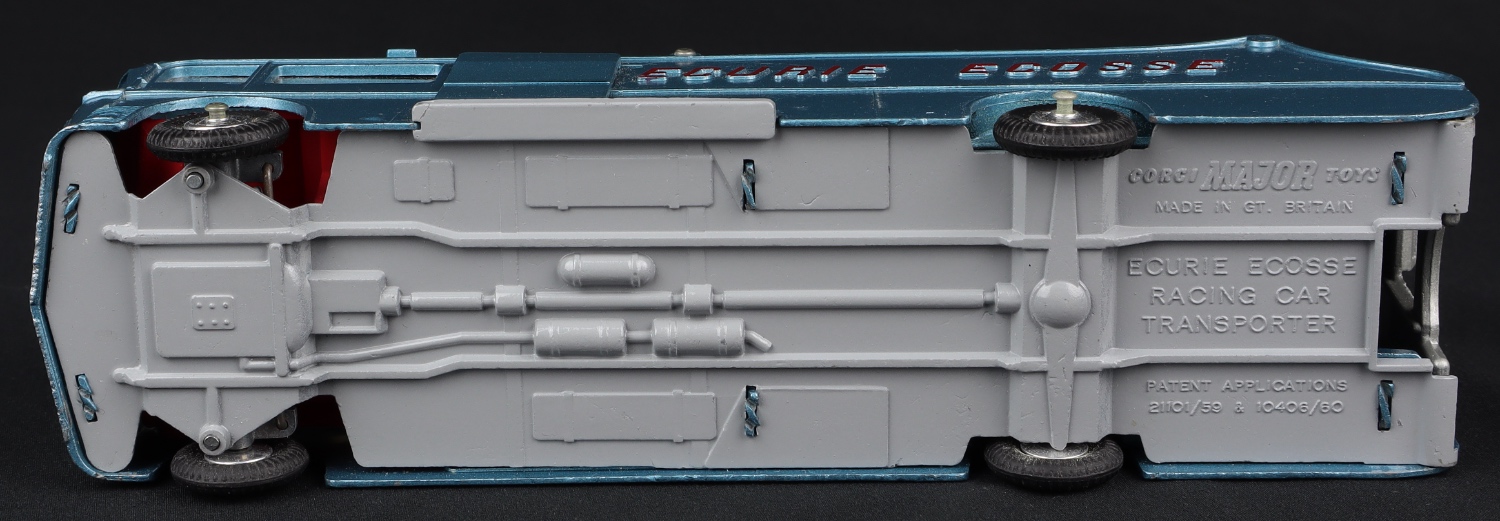 Ecurie Ecosse Racing Car Transporter by Corgi Toys, No. 1126. Late issue in pale metallic blue with red lettering, a more difficult find with a RED INTERIOR. Very near mint /in the end flap box. With Leaflet. From The Gower Collection. QDT starting bid £350. Please note that QDT apply 12.5% buyer's commission.