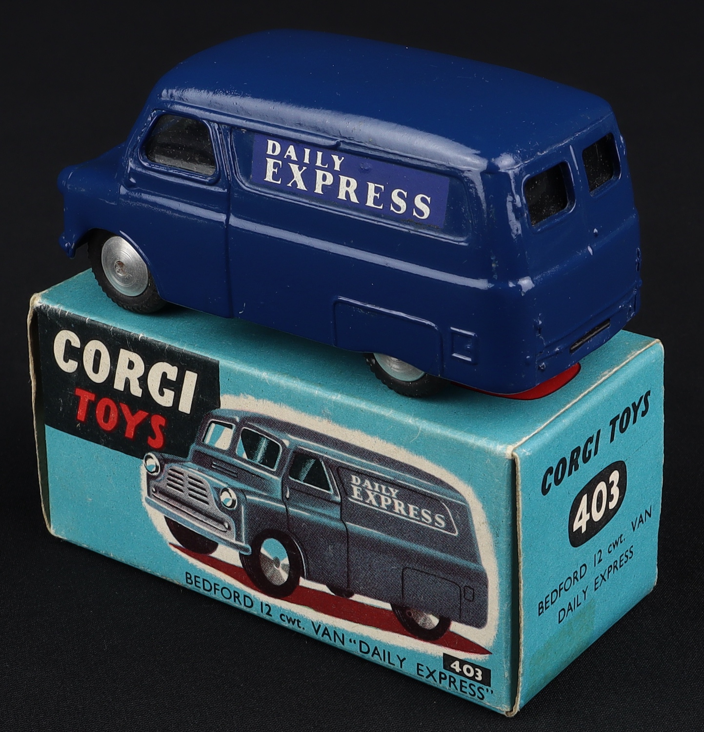 A gleaming vivid original vibrant blue paint finish on this early Bedford Van. One of the first Corgi models made, manufacture of this model began during 1956. Complete and bright ‘Daily Express’ label on both sides. Flat spun wheels, shiny base (tiny tarnished spot).