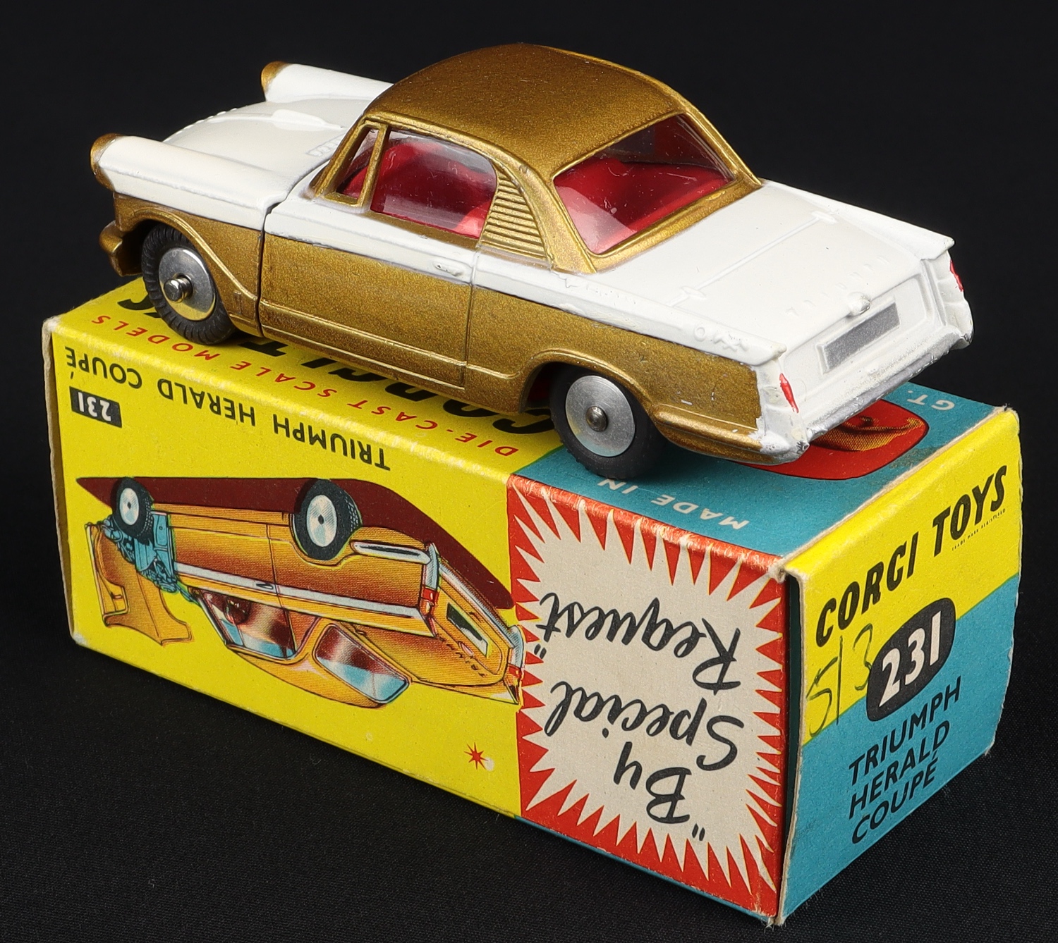 Triumph Herald Coupe by Corgi Toys, No. 231. Very, very near mint boxed. Gold and white version. With air filter. From The Rickman Collection.