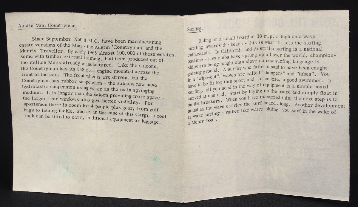 Issued between 1965-69, this popular ‘Surfing’ Mini model has a sea-green finish, ‘wood panelling’, vivid yellow interior, jewelled headlights, straight aerial, bright chrome roof-rack with two surf boards, and surfing figure.