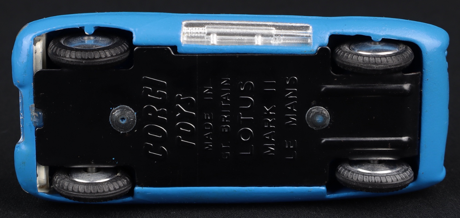 A sought-after Corgi model issued 1961-65 under this numbering. Eye-catching bright mid-blue finish, intact red and white bonnet stripe, white driver, racing number 7, shiny flat spun hubs. Fine original tyres.