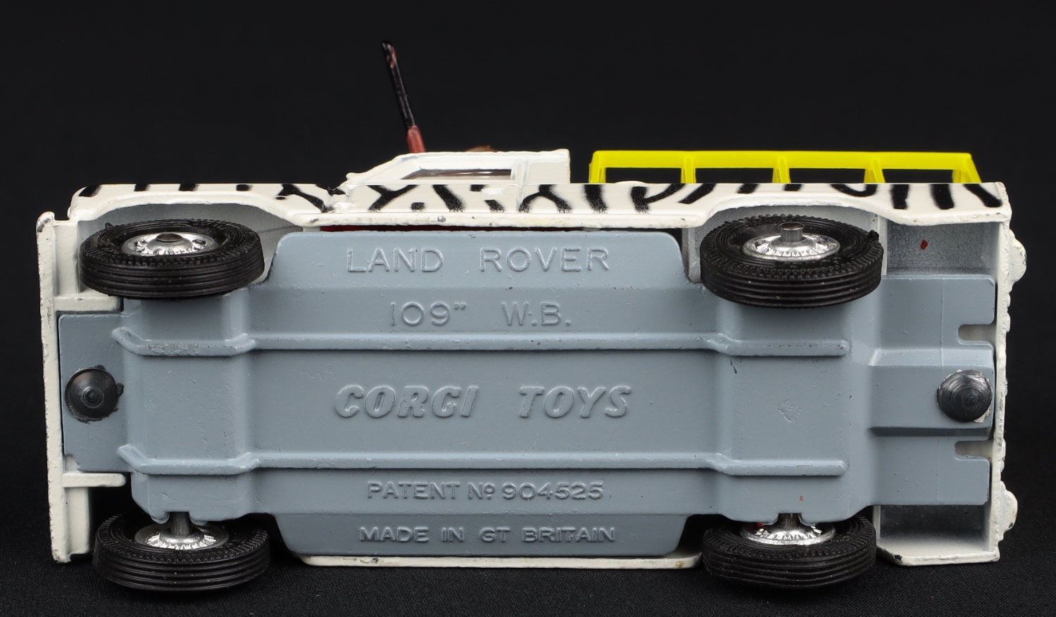 ’Zebra-striped Land-Rover with an intact circular ‘LIONS OF LONGLEAT’ label on the bonnet. Open hatch on the cab roof shows the keeper complete with the (usually missing!) rifle. Cast wheels with suspension.