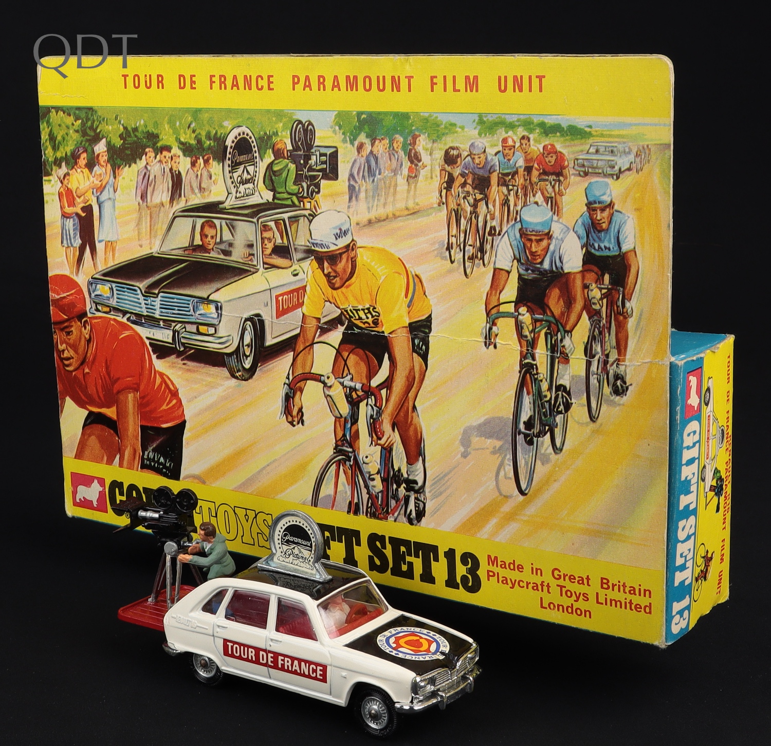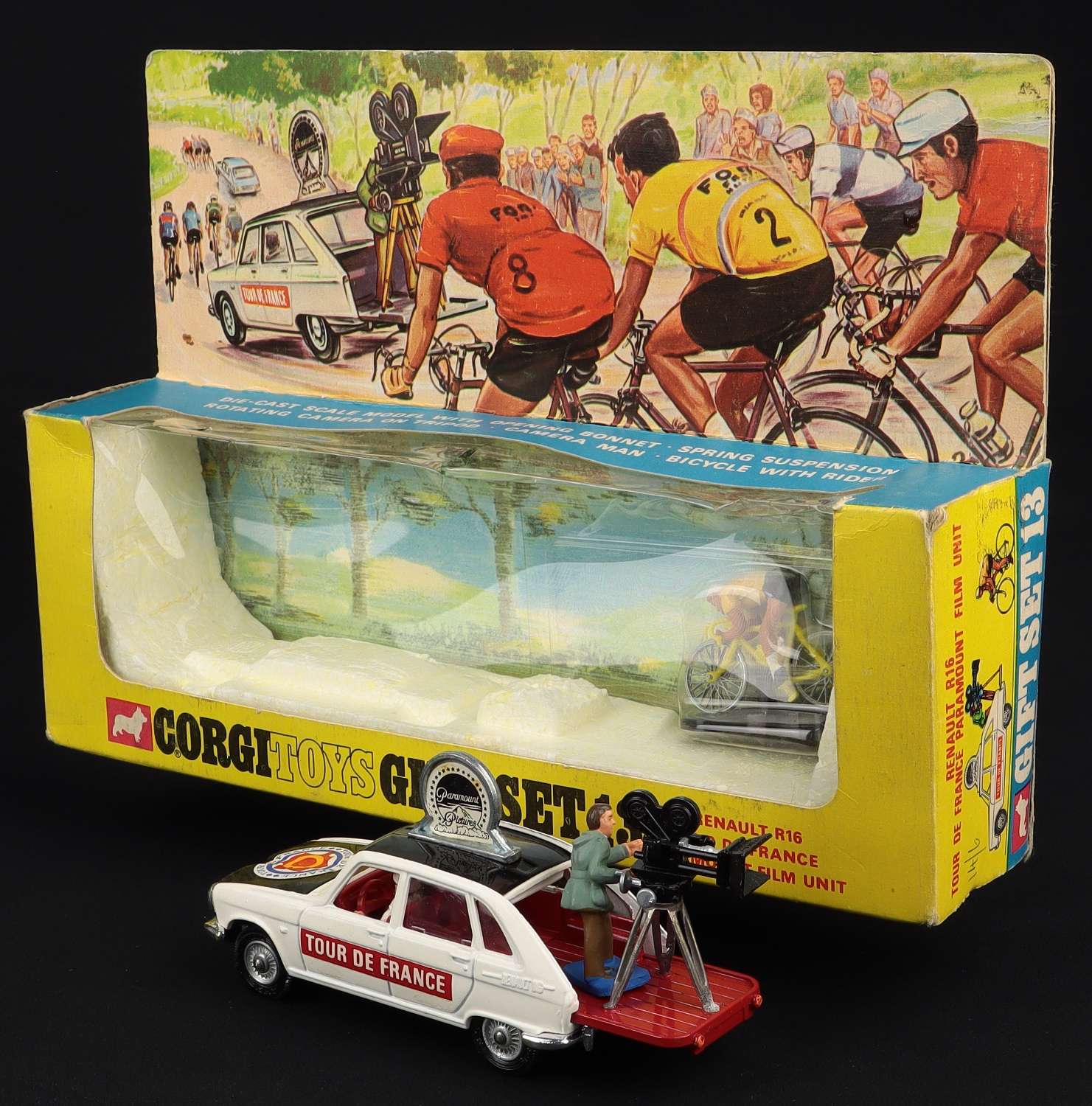 Renault R16 Tour De France Paramount Film Unit by Corgi Toys, Gift Set No.13. Very near mint/boxed with (near-complete) Model Specific Leaflet. First issue with detailed pictorial backdrop. From The Elmer Collection.