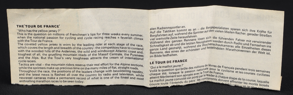 Later issues would have a plain orange sleeve insert, but this slightly earlier issue has the attractive tree-lined backdrop with the little clear blister attached, containing the race leader on his bicycle in his yellow jersey.