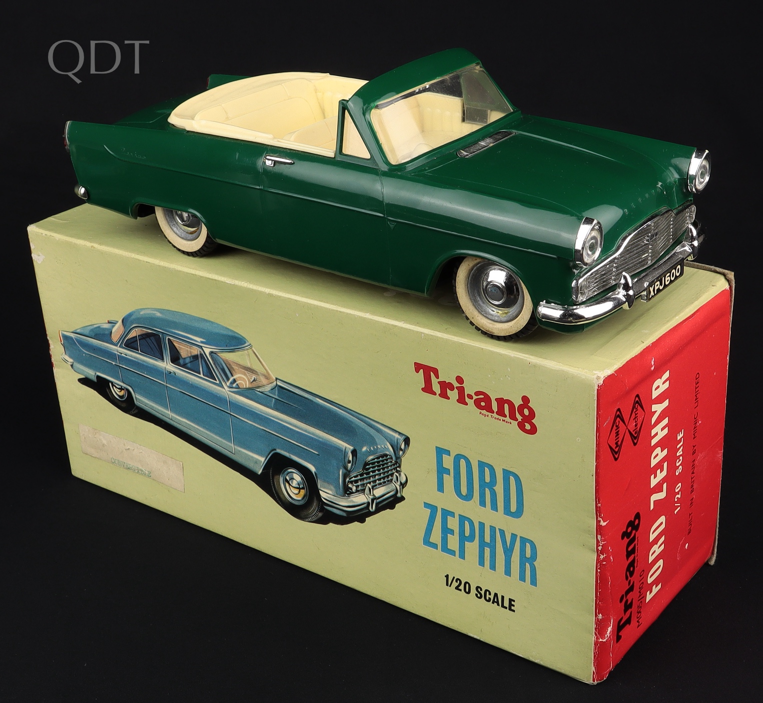 1:20 scale battery-operated Ford Zephyr Convertible model is finished in vivid deep green with a cream interior and bright chrome. Complete number-plates front and rear.