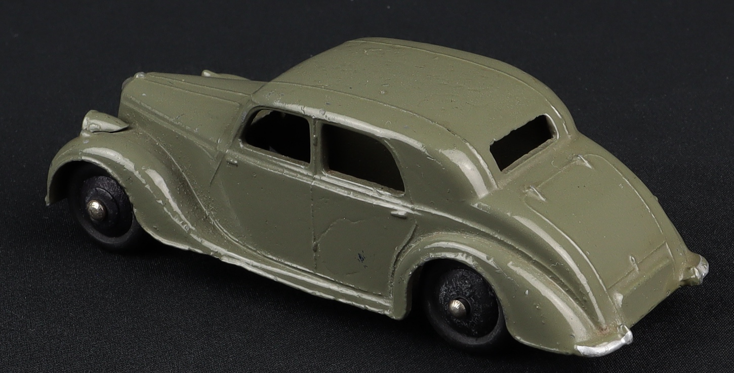 Riley Saloon by Dinky Toys, No. 40A. Very scarce early issue in DEEP GREY with BLACK WHEELS. Very near mint/never boxed individually. From The Reference Collection.