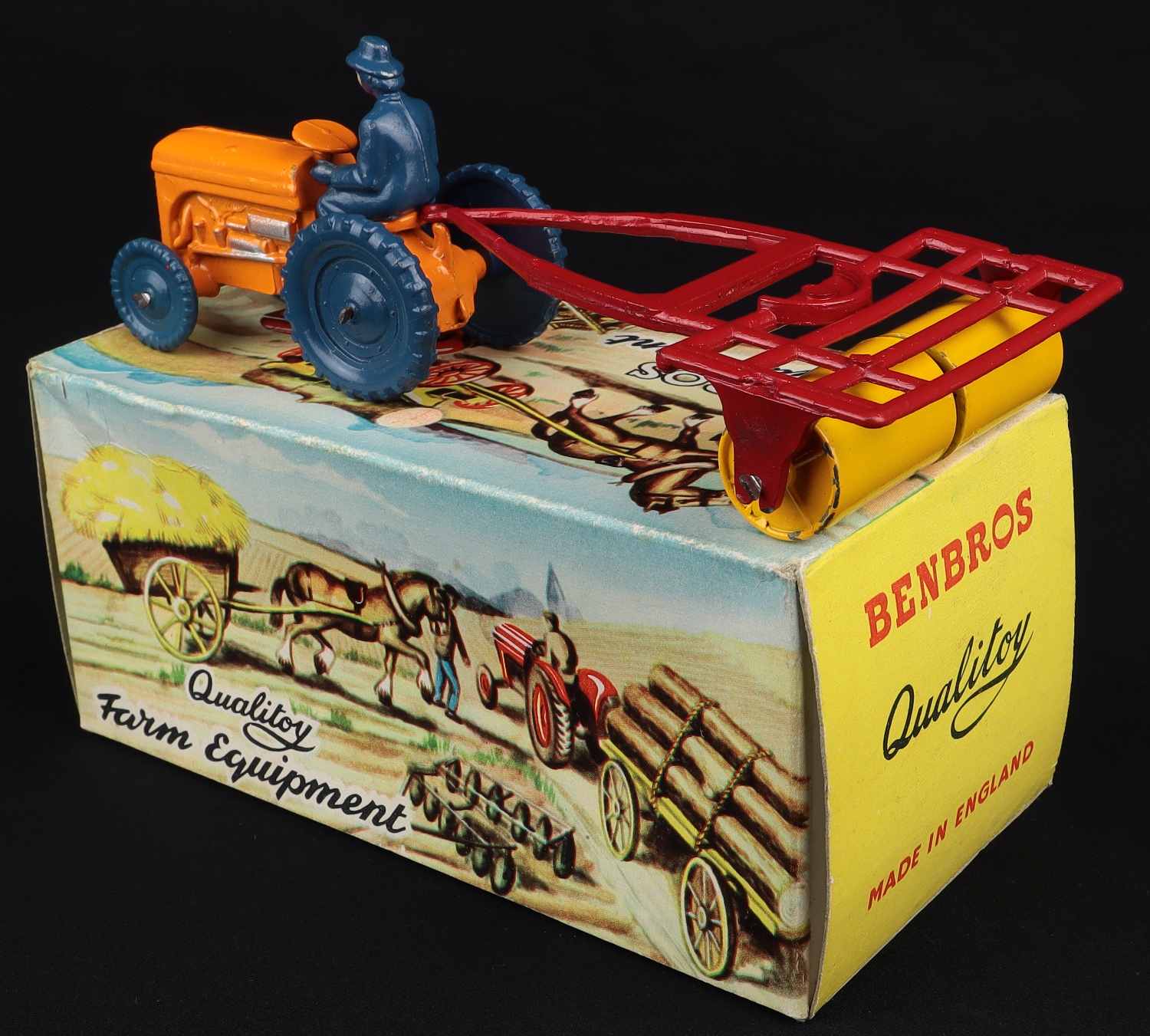 Ferguson Tractor with Roller by Benbros Qualitoys Farm Equipment Series. Near mint plus - very near mint/boxed. Nice box. QDT starting bid £100. Please note that QDT apply 12.5% buyer's commission.