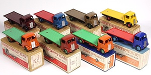 An array of Dinky Guy Flat Trucks with Tailboards (513, 913, 433, issued between 1947-58) – the rarest being 913 in yellow and green with green wheels.