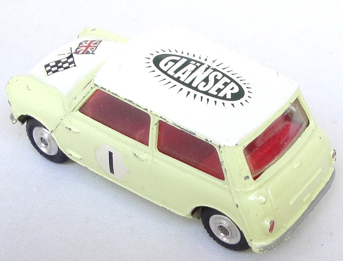 Corgi 227 Morris Mini-Cooper Competition Model. Excellent/unboxed. Rare PROMOTIONAL ISSUE "GLÄNSER". Primrose yellow & white, racing number 1. From a Corgi enthusiast in Germany.