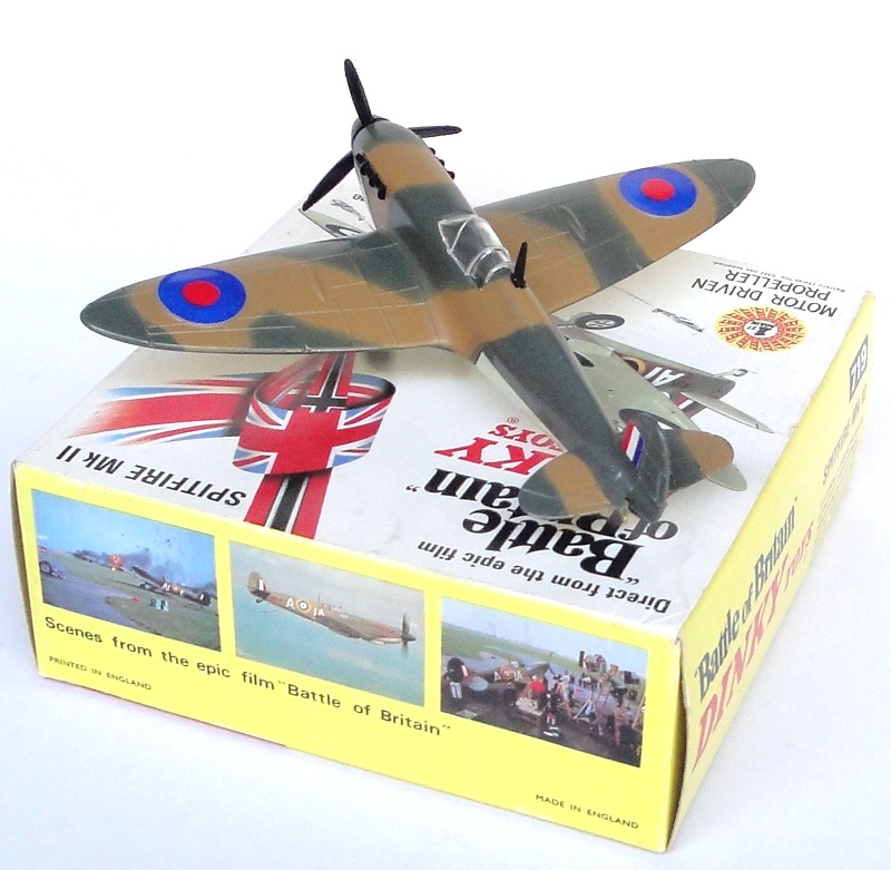 1) Dinky 719 Spitfire. In mint unused condition with as-new packing card surround and unapplied transfers. 2 original leaflets (including one ‘Warning’ notice). Box is crisp and clean with vibrant colours. Very minor age wear. No punctures or graffiti.