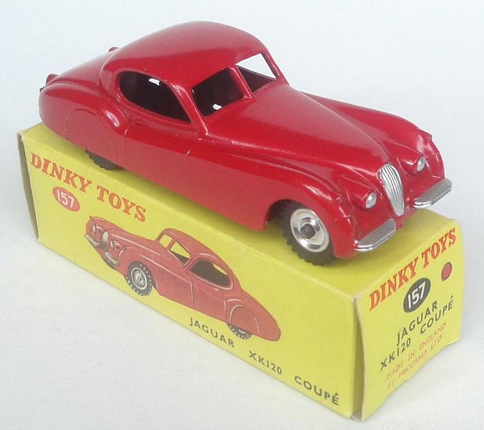 Dinky 157 Jaguar XK120 Coupe. Red. Scarce SPUN WHEELS version! Very near mint/boxed (late picture box with correct colour spot). Rare.