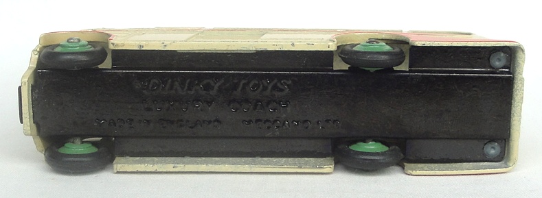 Dinky 281 Luxury Coach. Cream, orange flash, GREEN wheels. Very near mint/unboxed. Scarce. From The Reference Collection.