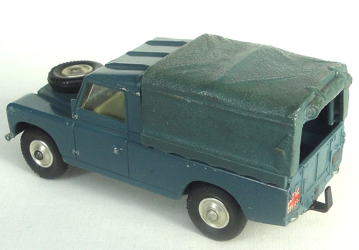 Corgi 351 Land Rover. Excellent plus/unboxed. RARE version in RAF Blue, with YELLOW INTERIOR & SUSPENSION, SPUN WHEELS, matching RAF BLUE PLASTIC TILT. Late issue. Excellent plus/unboxed. From The Heart of England Collection.
