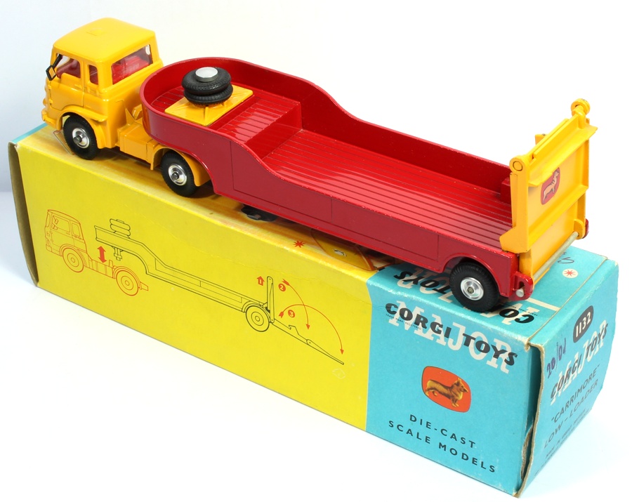 In fine, all original condition, with both wing mirrors intact notably. Close to perfect original yellow and red finish with bright metal parts, both spare tyres, and a delightful and complete Corgi dog logo at the rear folding ramp.