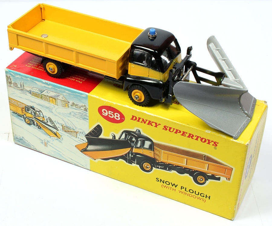 Dinky 958 Guy Warrior Snow Plough with Windows. Near mint plus/boxed, with card packing piece. Scarce version with a silver blade and presented in the picture box! From 'The Heart of England' Collection.