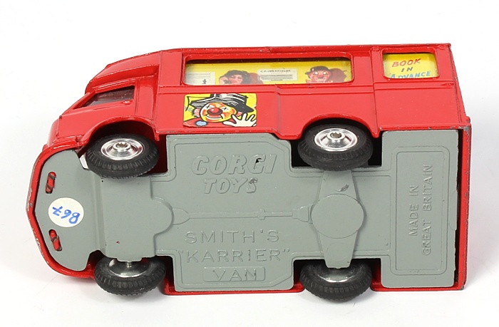This Karrier Bantam van has a bright red and blue paint finish, a complete ‘BOOKING OFFICE’ label on the cab, lovely detailed labels/transfers at sides (light wear and a very small nick to one) and circus label at the rear. Shaped spun wheels with suspension.