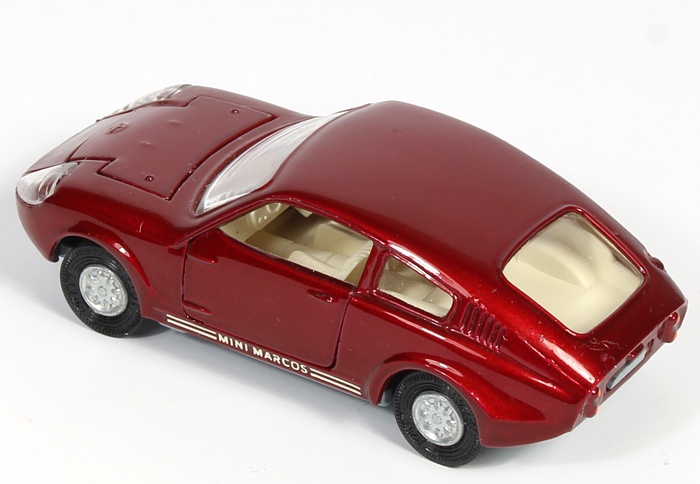First issued during 1968, this model is finished in a lustrous metallic maroon finish with a white interior. Opening doors and bonnet, sliding seats, steering wheel and of course, Golden Jacks wheels. Notably perfect ‘MINI MARCOS’ transfers on both sides.