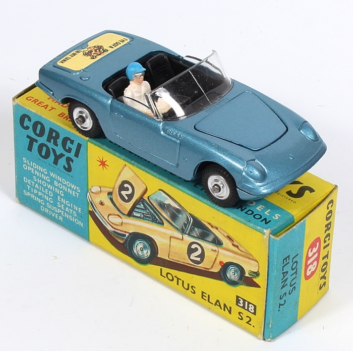 Corgi 318 Lotus Elan S2. Mint/boxed, with packing card & sheet of racing numbers. From The Monty Calme Collection.