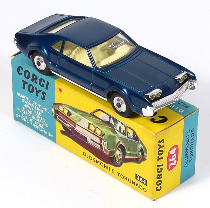 Corgi 264 Oldsmobile Toronado. Very near mint/boxed. Deep metallic green-blue issue. With SPUN WHEELS. Scarce. From The Berlin Collection.
