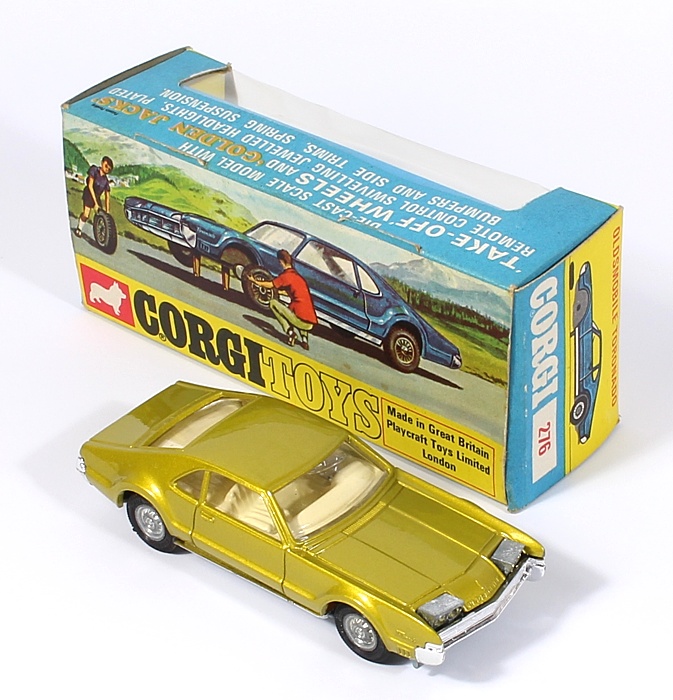 Corgi 276 Oldsmobile Toronado. Very, very near mint/boxed (tear to inner). Harder to find metallic green-gold issue with Golden Jack wheels. With model specific leaflet/Corgi Club Membership Form. From The Monty Calme Collection.