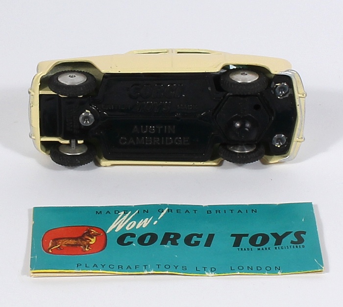 Corgi 201M Austin Cambridge Saloon. Very near mint/boxed. Cream with green-tinted windows. Scarce. With colour promotional booklet. From a small cache of period unsold shop stock.