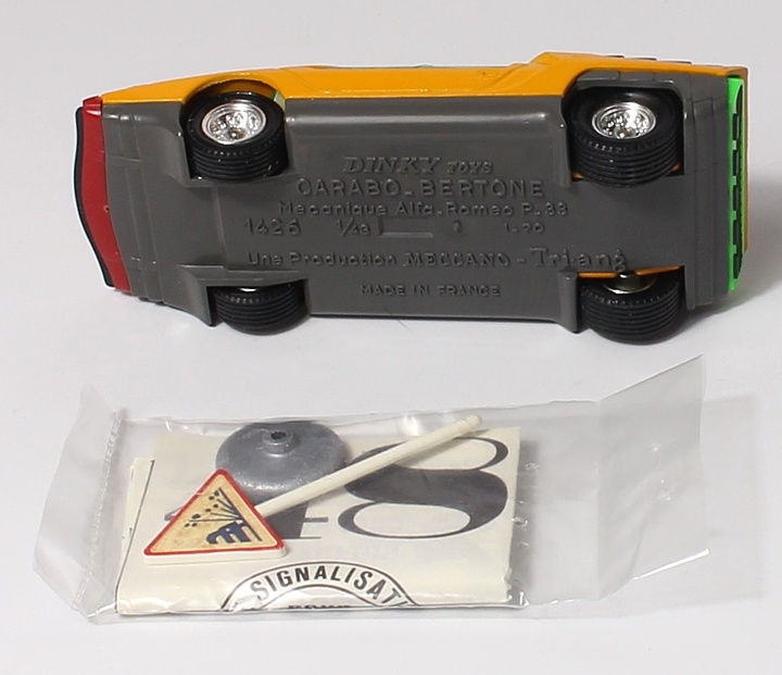 An impressive example of this Carabo Bertone model issued between 1969-71. Bright orange-yellow and black issue with red, black and green plastic parts, blue-tinted windows and a detailed interior. Shiny wheels and supple tyres. 1:43 scale.