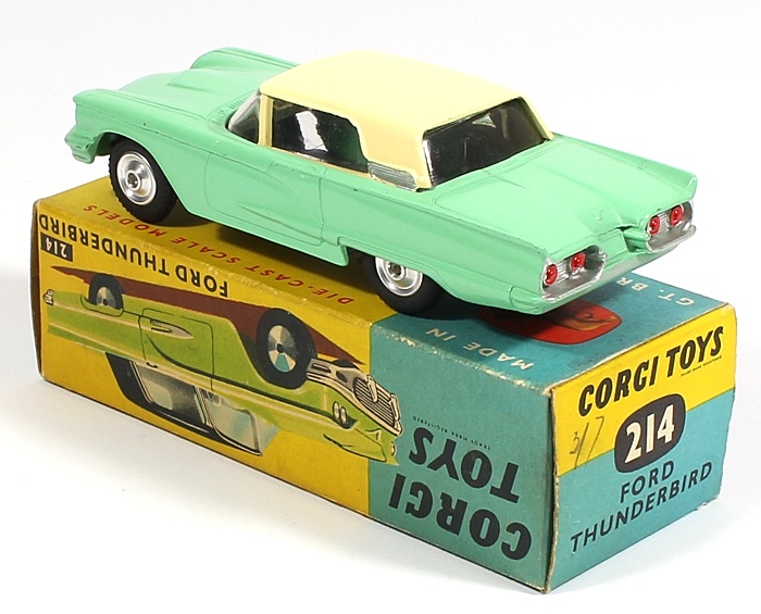 Corgi 214 Ford Thunderbird. 2nd issue, with SHAPED SPUN WHEELS, correct with a BLANK REAR NUMBER-PLATE. Very near mint/boxed. From The Berkshire Collection.