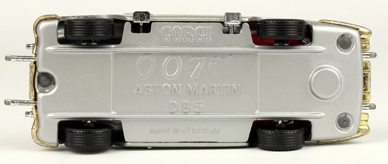 This James Bond Aston Martin is finished in bright metallic silver with a red interior, gold radiator & bumpers, and 4-spoked Whizzwheels. Very close to mint condition. If you want to fault it and peer at it with a magnifying glass, you will note tiny bumper rubbing ( probably due to box contact).