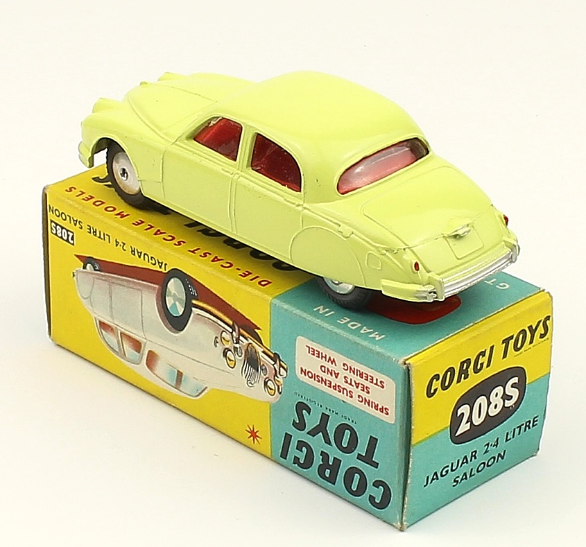 Corgi 208S Jaguar 2.4 litre Saloon. DEEP LEMON version with suspension on flat spun wheels. Very near mint/boxed. From The Old School Collection.