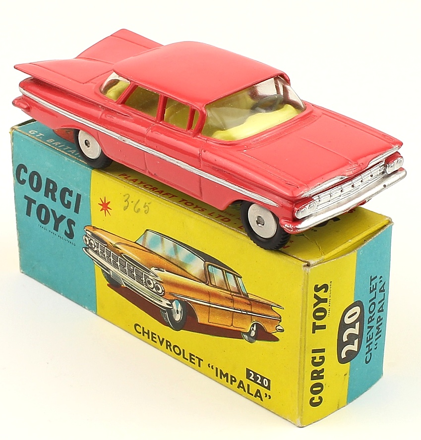 Corgi 220 Chevrolet Impala. Salmon pink issue with FLAT SPUN wheels. Very near mint/boxed. From The Berlin Collection.