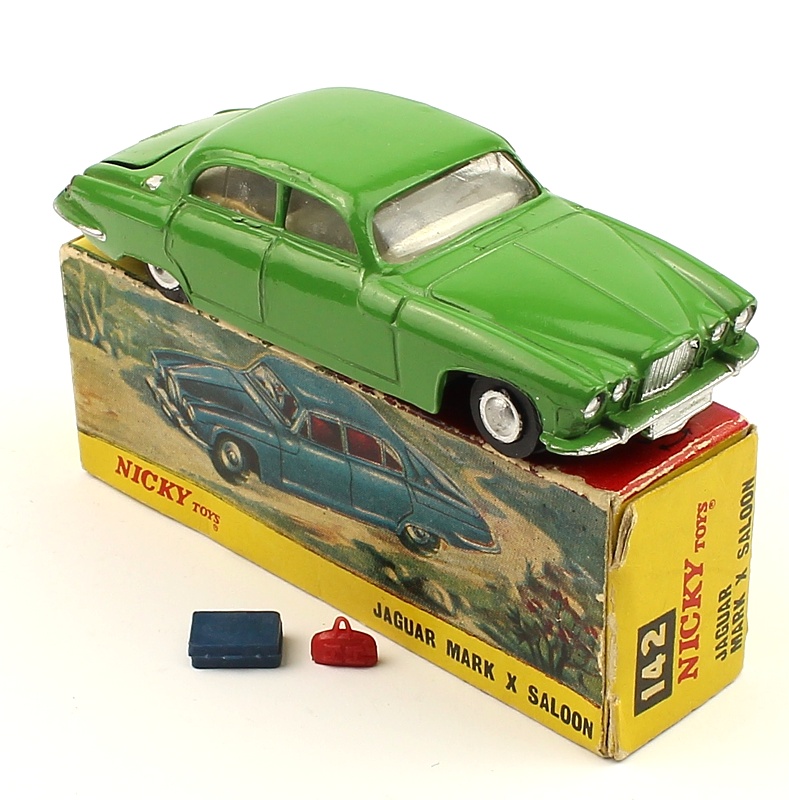 Nicky/Dinky Toys 142 Jaguar Mark X Saloon. Grass Green version. Very near mint/boxed with 2 pieces of luggage. Scarce. From The Cumbrian Collection.