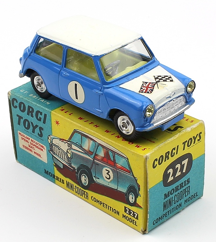 Corgi 227 Morris Mini-Cooper Competition Model. Very near mint/boxed. Deep mid-blue with white roof and bonnet issue. Scarce with YELLOW interior. Bold racing number 1. From the 'Exclusively Mini' Collection. Bids are invited - please see the relevant section on our Faq Page. QDT starting bid £300. Please note that QDT apply 10% buyer's commission, with a ceiling of £100.