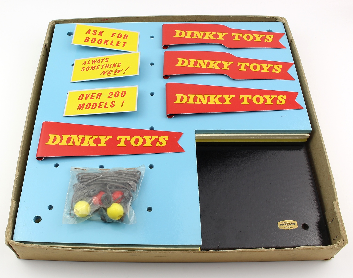 A colourful and complete Dinky display stand composed of wood and metal, complete with all of the accessories, including the colourful and eye-catching promotional painted metal ‘flags’, Instruction Leaflet for assembly and still-sealed bagged fixing components.