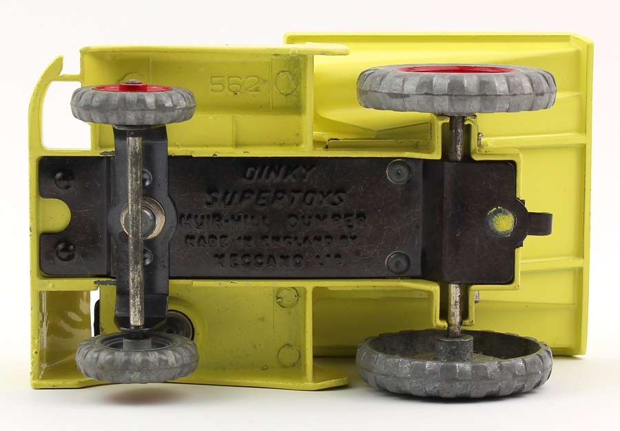 A nicely-constructed toy; the driver can be made to swivel with his seat, and the dumper tips. Tow hook and red painted hubs. No sunfading. Bright baseplate. These dumper trucks are so often found with many chips. This model has a chip largely covered by the tipping section and minute scrutiny has found a couple of little touch-ins.
