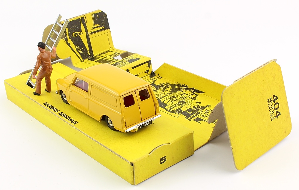 A difficult model to find (issued 1966). Vivid yellow Morris Mini van does not appear to have ever been removed from its plinth. In virtually mint condition, securely fastened to the inner by means of the original fixings. Shaped spun wheels are shiny.