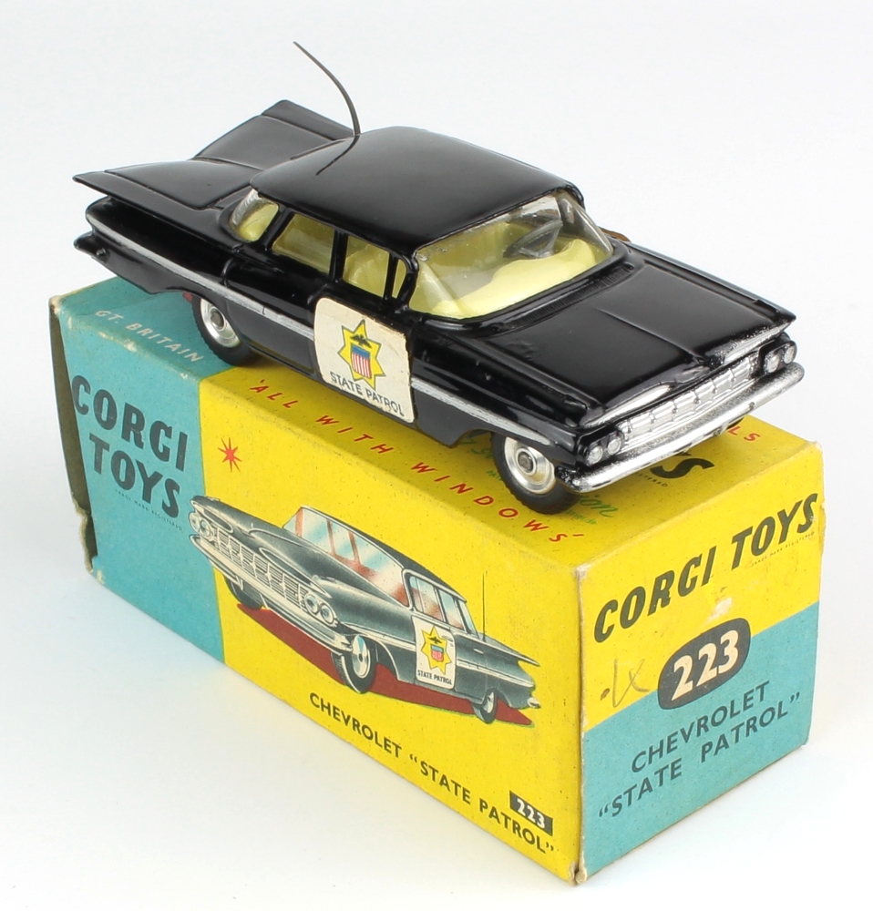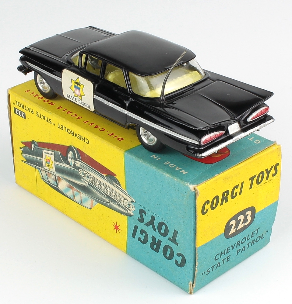 Corgi 223 Chevrolet Impala "State Patrol". Very near mint/boxed. Paper label version. SHAPED SPUN WHEELS. From The Berlin Collection.