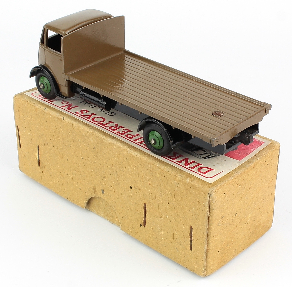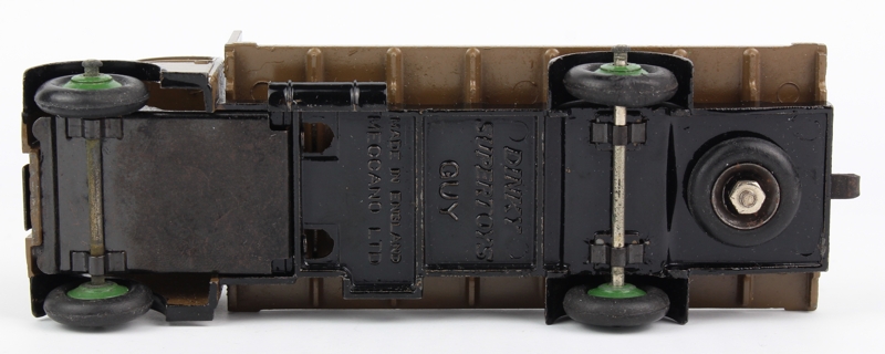 A scarce and desirable Dinky commercial. This is a 1st issue Guy Flat Truck made between 1947-48 in this rare khaki and black finish with green wheels. No triangular lugs next to the number plate, early wheels, and rear axle fixed by tin clips. Small unpainted hook.