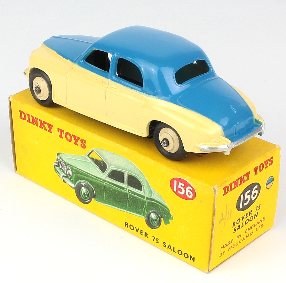 Dinky 156 Rover 75 Saloon. Mid-blue and cream. Large print baseplate. 1 tyre flat spot ( otherwise very, very near mint/boxed. Scarce. From The Cumbrian Collection.