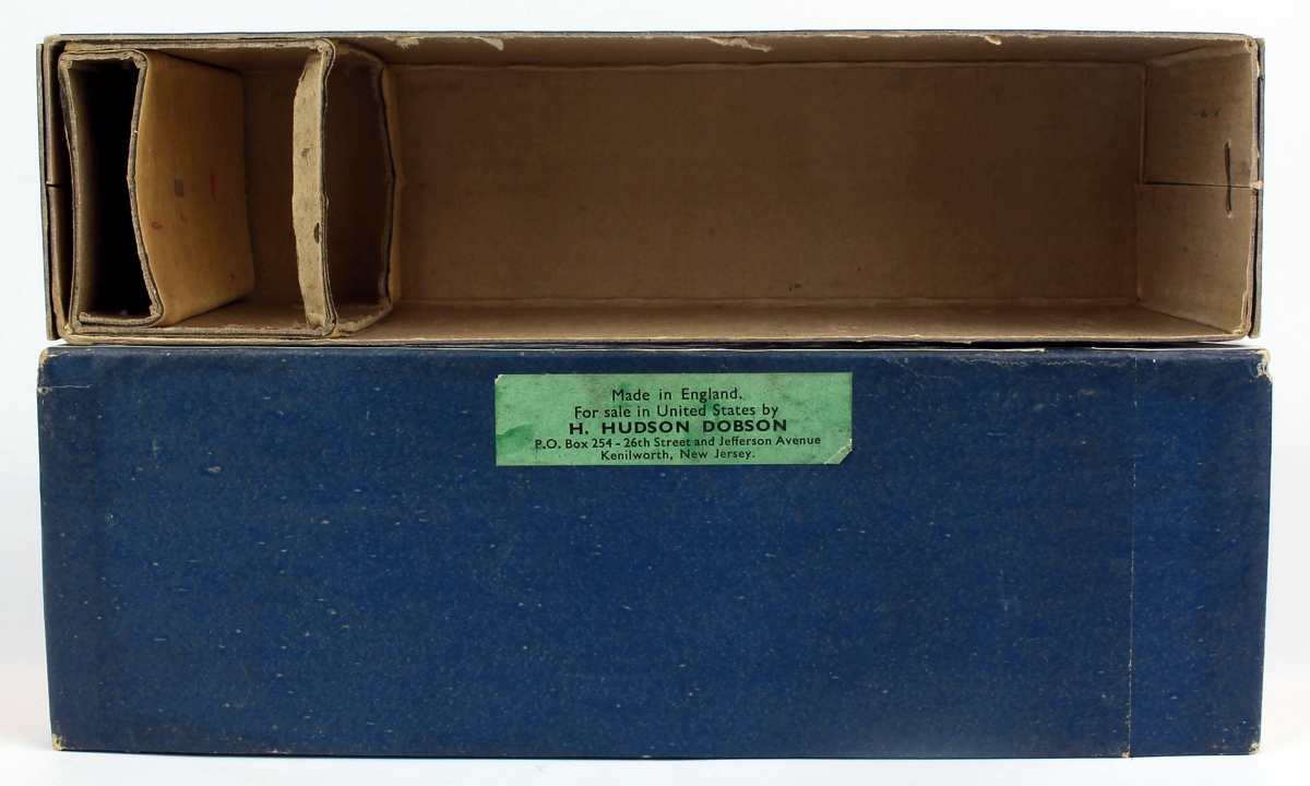 It comes in the correct early deep blue box with clean and bright paper labels (small nick or two). English only print, specifically made for the U.S. market only. Area of sunfading on one side of the box. Note the unusual light green Hudson Dobson export label on one side and the FAO Schwarz New York period price label.