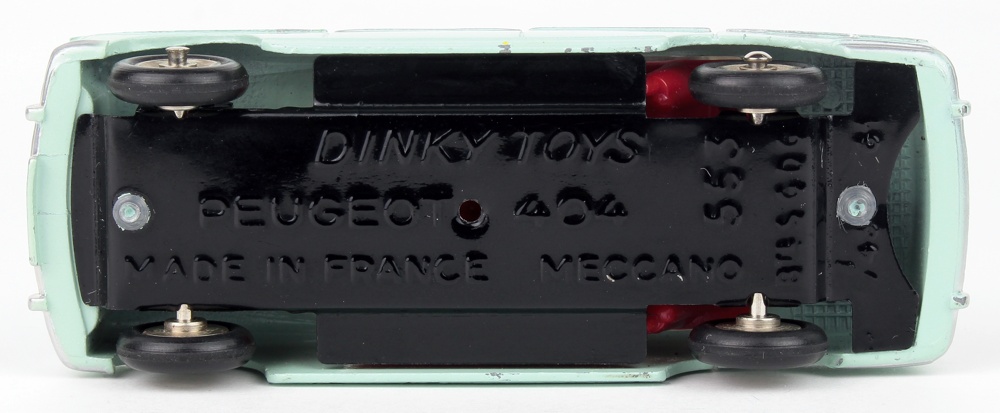French Dinky 553 "404" Peugeot. 2nd type, Duck-Egg Blue-Green, bright red interior, smooth tyres. Nice box! Very near mint/boxed. Scarce. From The Salopian Collection.