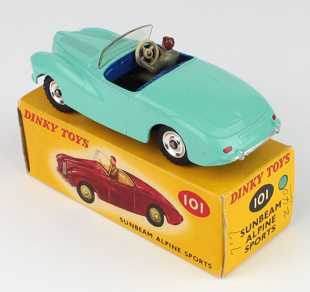 Dinky 101 Sunbeam Alpine Sports. Turquoise with SPUN WHEELS. Very rare variation. Very near mint/boxed. From The Cumbrian Collection.