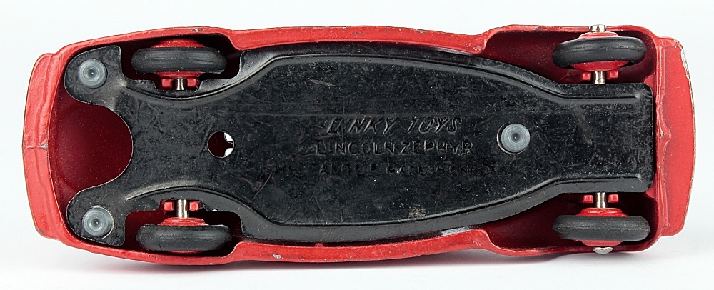 Dinky 39C Lincoln Zephyr Coupe. Rare in bright red with matching wheels. Late export issue - very hard to find. Near mint/never boxed individually. With Lincoln Zephyr Period Advertisement. From The Phillips Collection. QDT starting bid £400. Please note that QDT apply 12.5% buyer's commission.