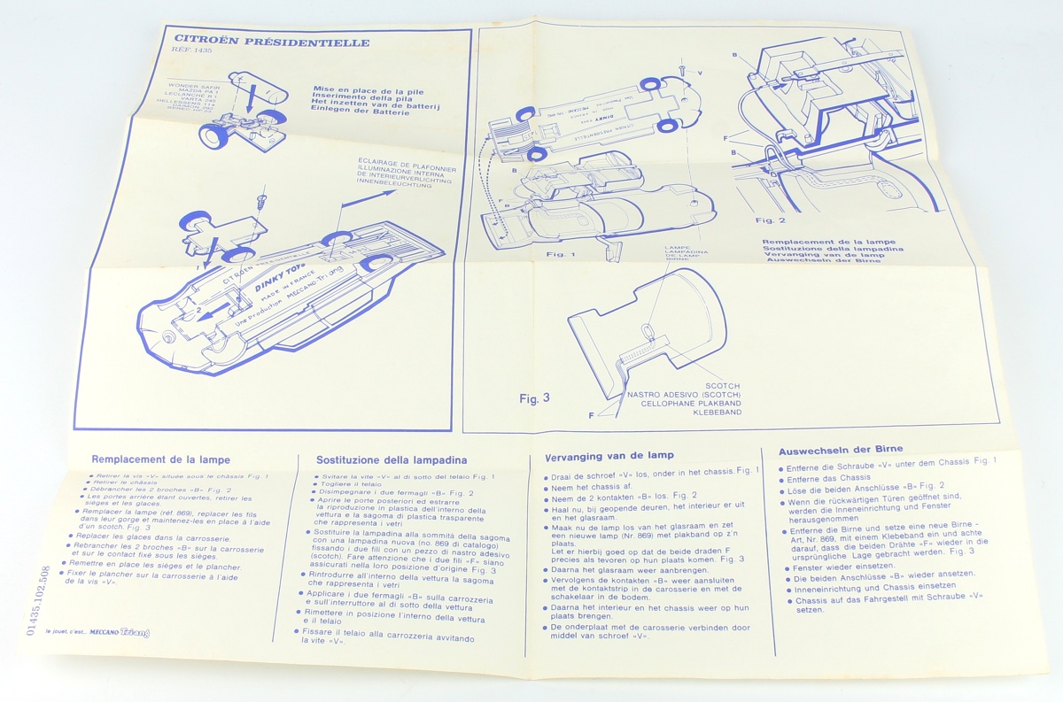 French Dinky 1435 Citroen Presidentielle. Very near mint/boxed. Includes original flag, intact bonnet emblem and Instructions Leaflet. A rare promotional Citroen Presidentielle in the deep blue LIMITED EDITION PRESENTATION BOX. From The Brighton Collection.