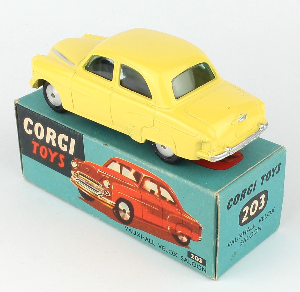Corgi 203 Vauxhall Velox Saloon. Very, very near mint/boxed. LEMON version with original silver bonnet flutes. From The Nelson Collection.